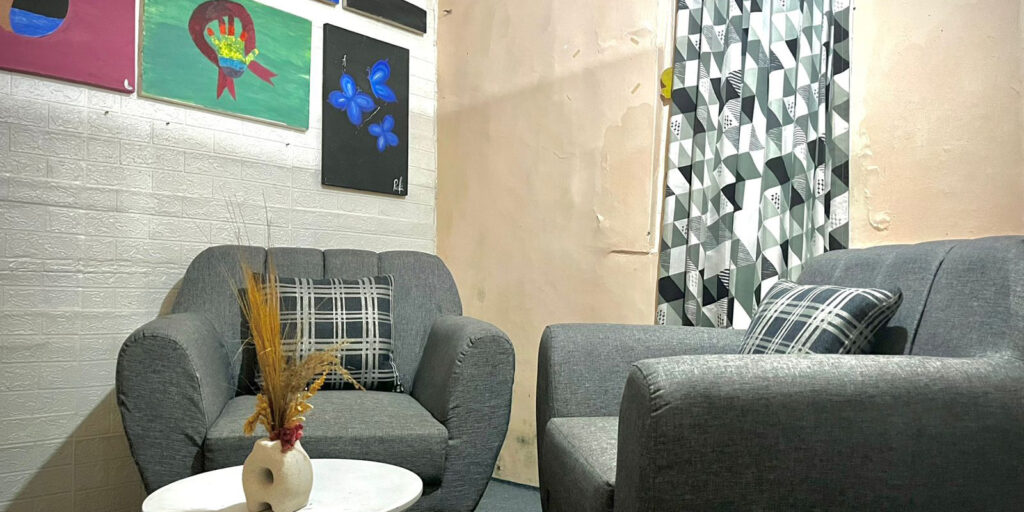 Two gray armchairs with plaid cushions are arranged around a small round table with a vase. Abstract paintings hang on the wall, and geometric curtains cover the window—creating a calm space to discuss issues like HIV stigma in Indonesia.