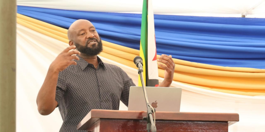 Munya stands at a podium, gesturing with his hands while speaking. A microphone and laptop are in front of him, with blue, yellow, and white fabric draped in the background.