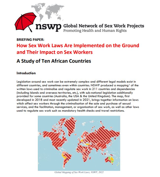 Briefing paper cover titled "How Sex Work Laws Are Implemented on the Ground and Their Impact on Sex Workers,"
