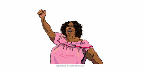 Illustration of a woman in a pink top raising her fist and appearing to shout, set against a white background.