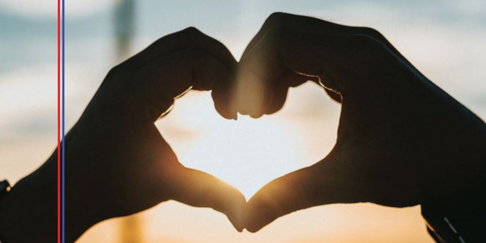 Two hands form the shape of a heart against a bright, setting sun in the background.