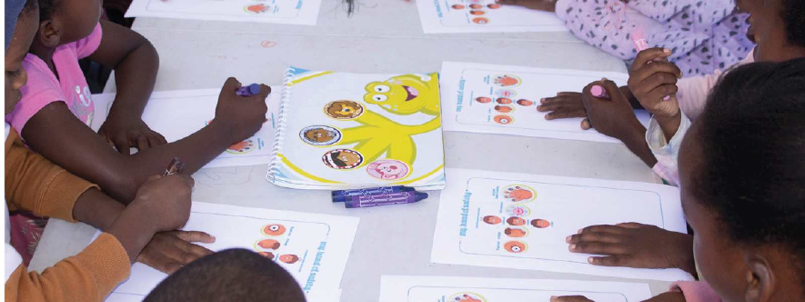 Children sit around a table working on activity sheets with colorful cartoon characters and images, using markers or crayons, while receiving caregiver support for children with HIV in South Africa.