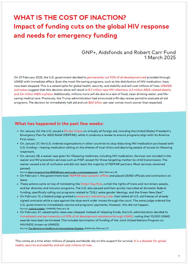 In response to the recent catastrophic funding cuts by the U.S. administration, Aidsfonds, GNP+, and the Robert Carr Fund have conducted an initial mapping of the impact on community networks and organisations. This final update includes additional analyses of the on-the-ground effects and provides crucial data to guide donors on how they can specifically contribute to the global HIV response during this funding crisis.